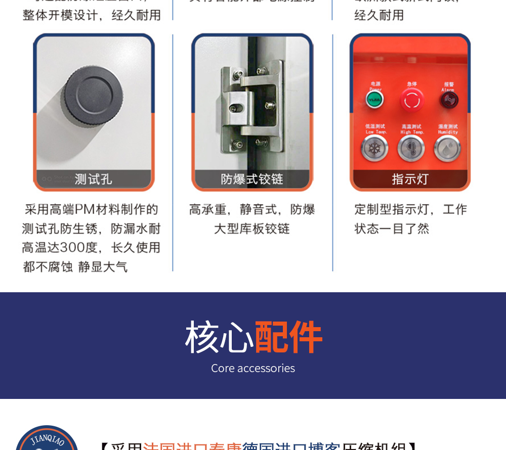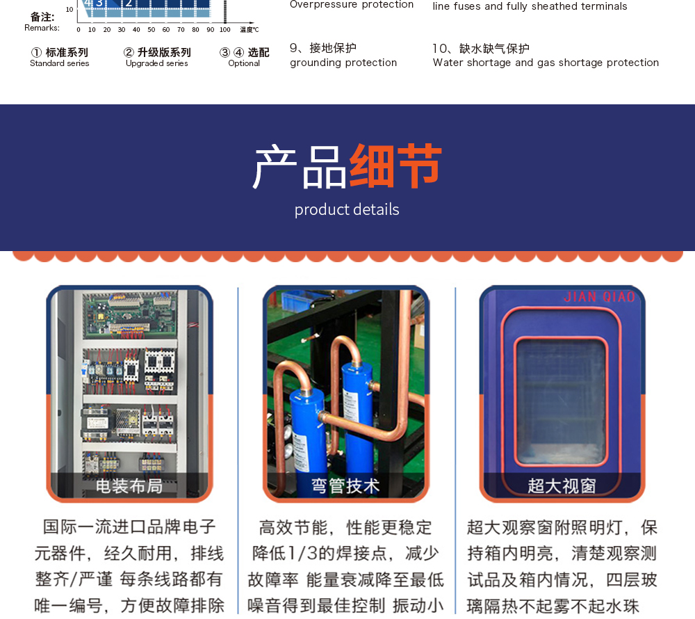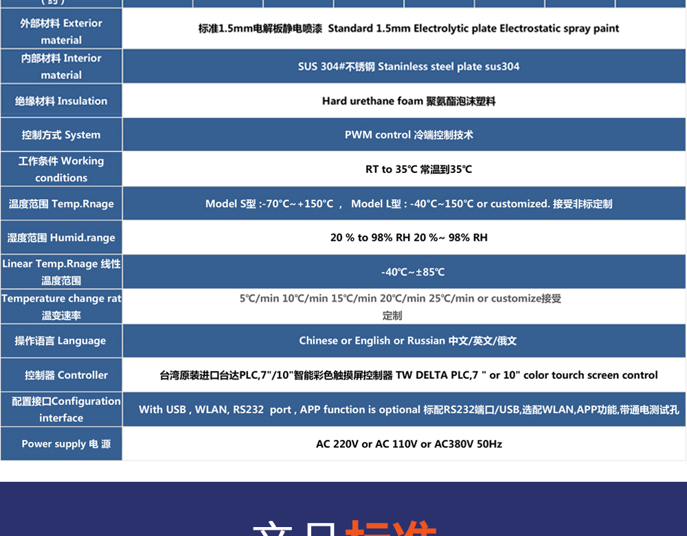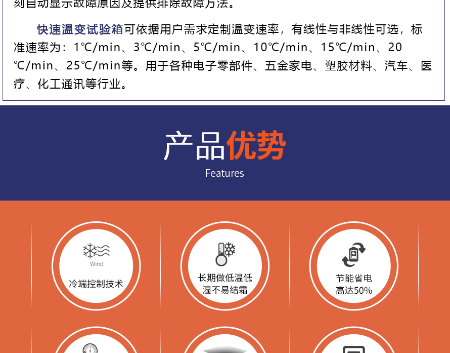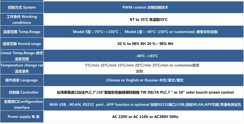 用途:快速溫變試驗箱主要用來測試各種材料耐熱、耐寒、耐干、耐濕的性能。本機采用中英文顯示彩色觸控式屏幕畫面,操作簡單,程序編輯容易,可顯示完整的系統操作狀況相關數據、執