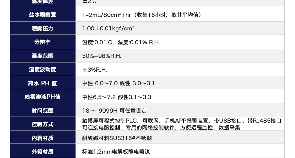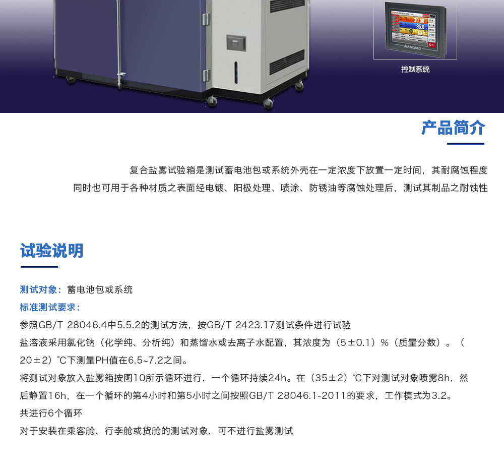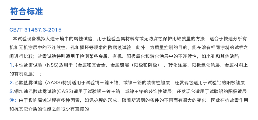 用途:復合鹽霧試驗箱是測試蓄電池包或系統外殼在一定濃度下放置一定時間,其耐腐蝕程度同時也可用于各種材質之表面經電鍍、陽極處理、噴涂、防銹油等腐蝕處理后,測試其制品之耐蝕