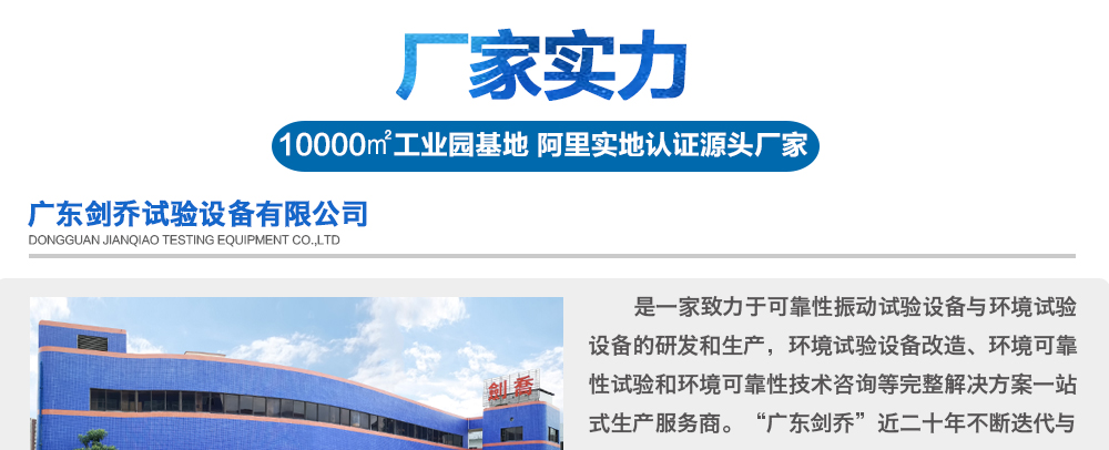 您好!歡迎光臨廣東劍喬試驗設備有限公司官網!主營:振動臺,振動試驗臺,電動振動臺,高頻振動臺,沖擊試驗臺